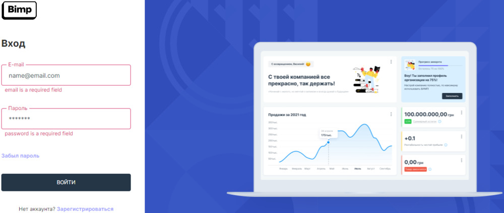 Для входа в аккаунт на сервисе Bimp используйте e-mail и пароль, внесенные при регистрации.
