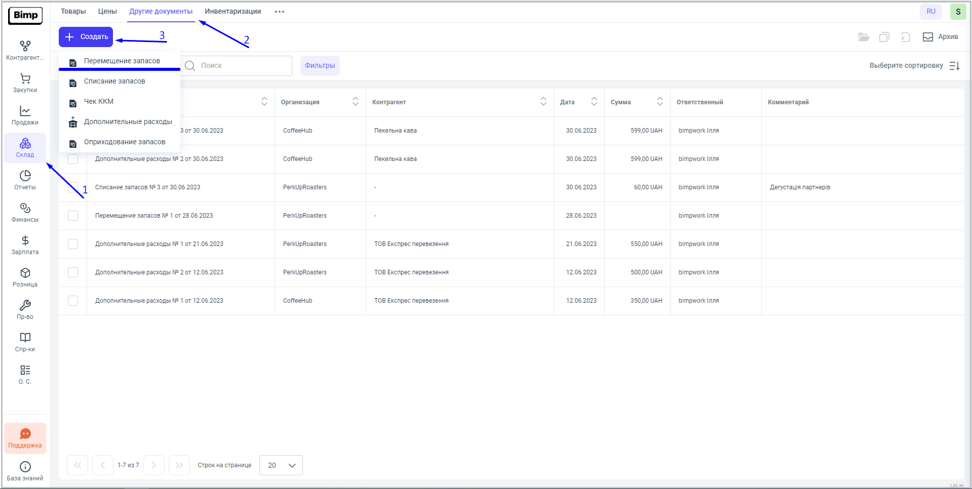 1. Для того чтобы переместить товар с одного склада на другой, необходимо из начально перейти в блок Склад, раздел Другие Документы, далее нажимаем на кнопку "Создать", в нижнем правом углу, и из списка выбираем необходимый документ "Перемещения запасов".