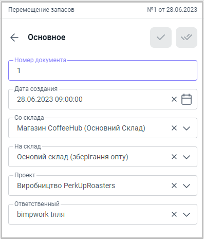 - Номер документа – вручную можно предоставить документу нужный номер или после сохранения документа система автоматически предоставит ему номер;