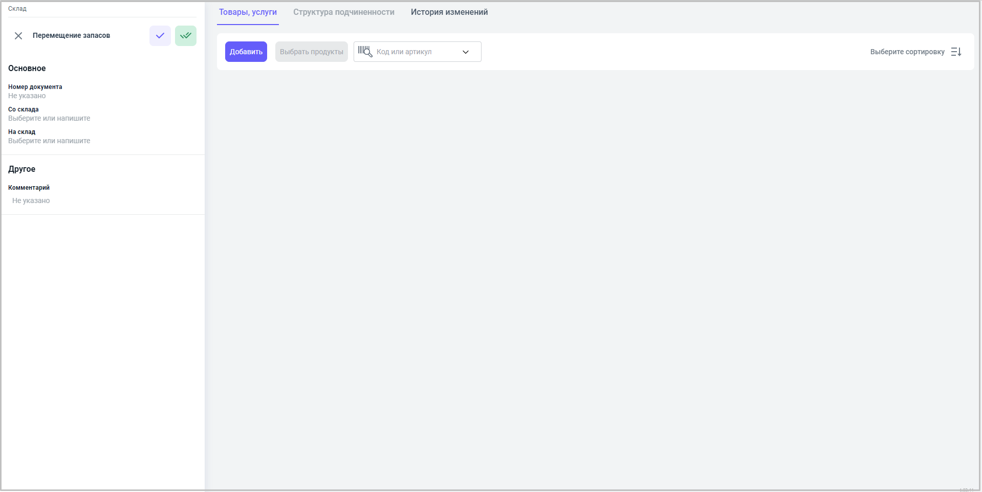 - На склад – перемещение товара/продукции на склад, который необходимо;