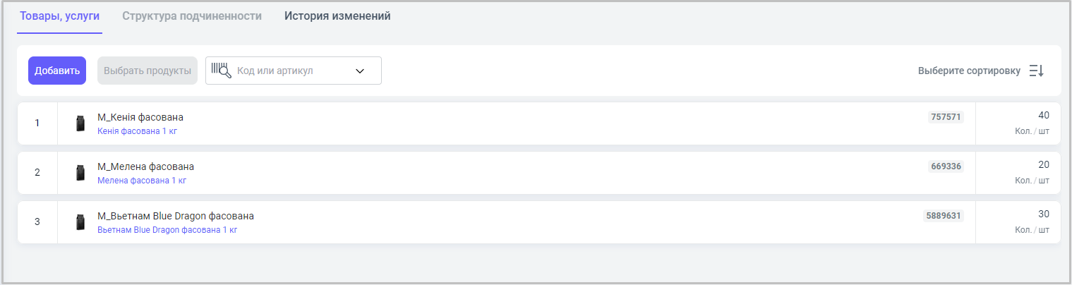 3. В правой части меню указываем - тот товар, который перемещаем и его количество. Также есть поле Поиск по артикулам, который поможет быстрее найти нужный товар или услугу.