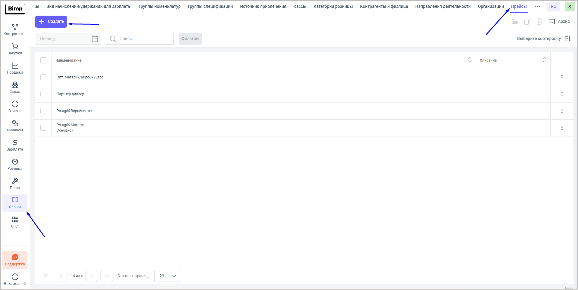 Справочник необходим для создания прайсов на реализацию товаров/услуг вашей компании, а также для отображения перечня прайсов компании.