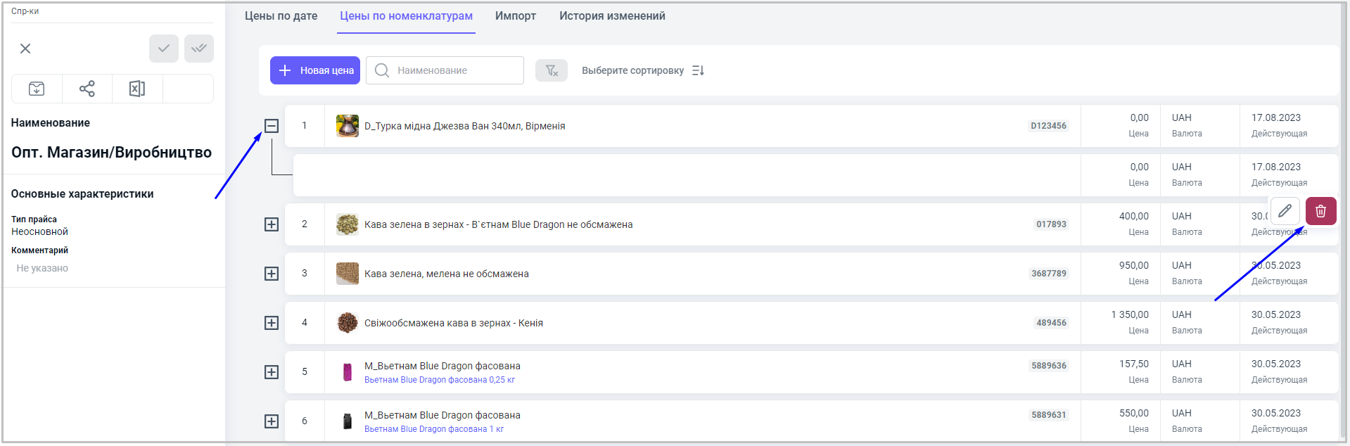 1. Нажать на нужный Прайс и перейти в раздел Цены по номенклатуре.