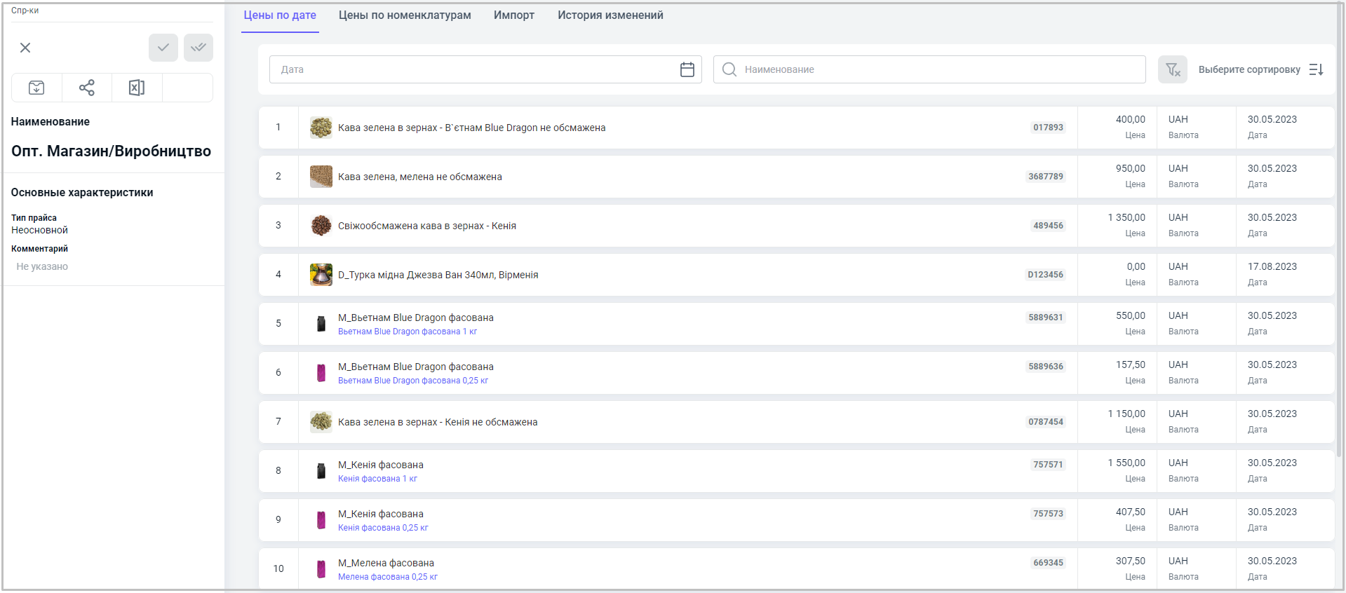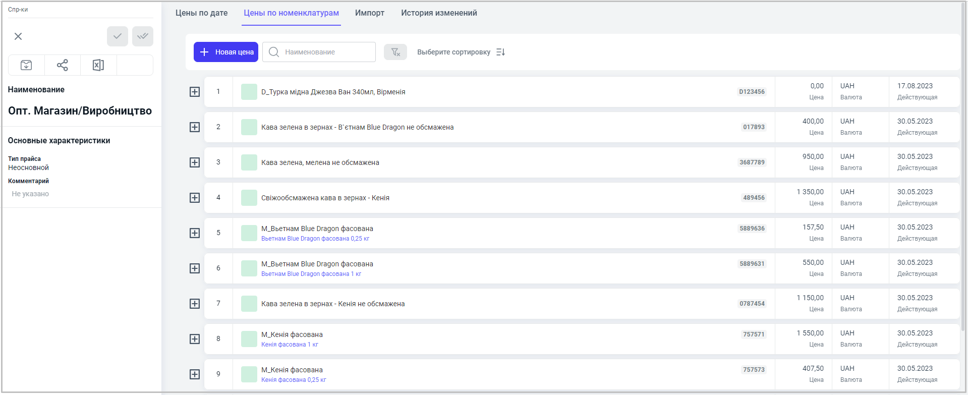 • Вкладка Цены по номенклатурам  — необходима, для отображения актуальных на текущей день цен на товары/услуги, а также для отображения всех предыдущих цен на товар/услугу, указанных ранее в прайсе.