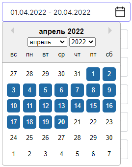 В строке фильтра нажимаем на виджет , и в первую очередь выбираем начало временого периода, а потом конец периода отображения информации в отчете.