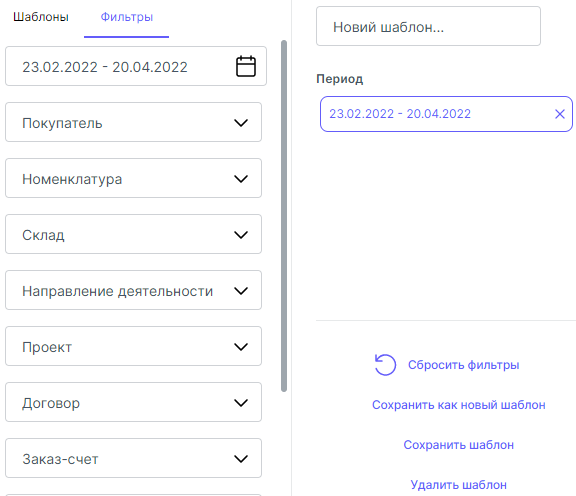 В случаи, когда нужно часто использовать одни и те, же показатели фильтров в отчете, то возможно сохранить их, как новый шаблон.