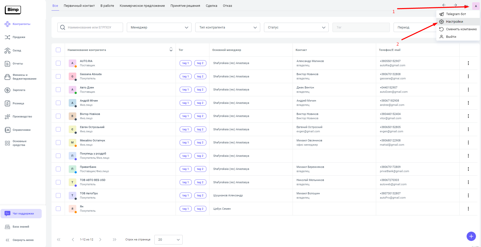 Для того чтобы изменить/добавить информацию о Вашей компании, необходимо выбрать пункт Настройки, расположенный в верхнем правом углу. Нажимая на кнопку, перед нами появляется список, где необходимо выбирать пункт Настройки.