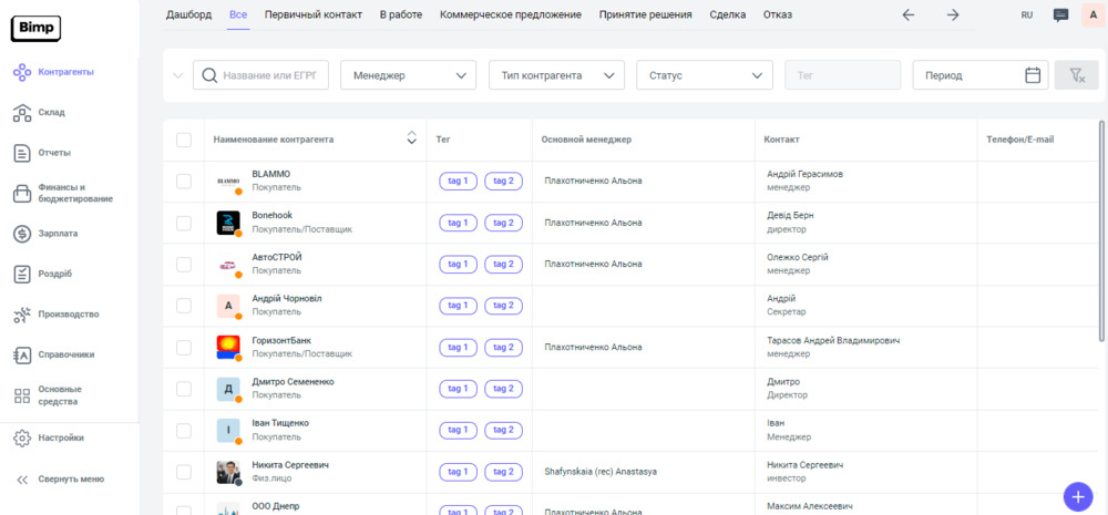 1. Переходим в карточку необходимого нам контрагента. Это можно сделать, через блок Контрагенты ➞ Карточка контрагента.