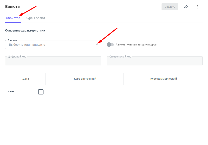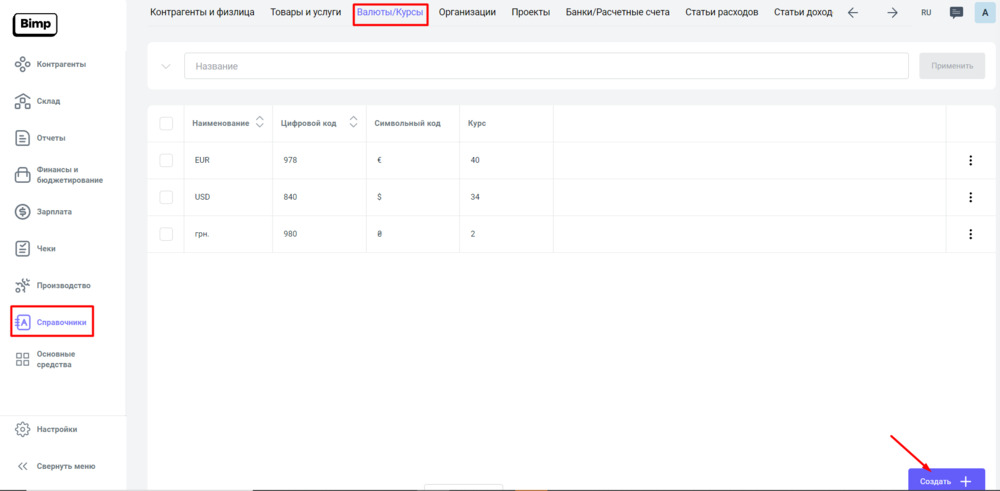 Прежде чем приступить к процессу Обмен валюты, необходимо проверить заполнена ли у вас информация в разделе сервиса Валюты/Курсы. Для этого, нужно перейти в блок Справочники, раздел Валюты/Курсы, где на рабочем поле добавляем документ для валюты, которую мы будем обменивать. Нажмите на кнопку “Создать”.