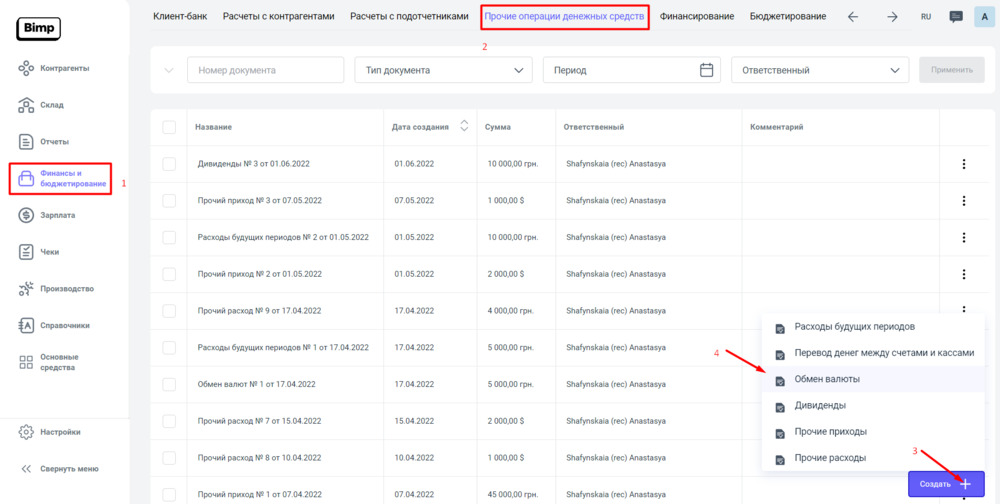 После вы переходите в раздел Финансы и Бюджетирование, подраздел Прочие операции денежных средств и нажимаем на кнопку “Создать”. Из выпадающего списка выбираем документ Обмен валюты.