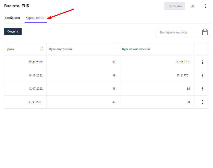 После сохранения. Автоматически сервис переносит данные по курсам во вкладку Курсы валют. Где мы можем в ручную указывать валюту, или же смотреть какие курсы подтягиваются.