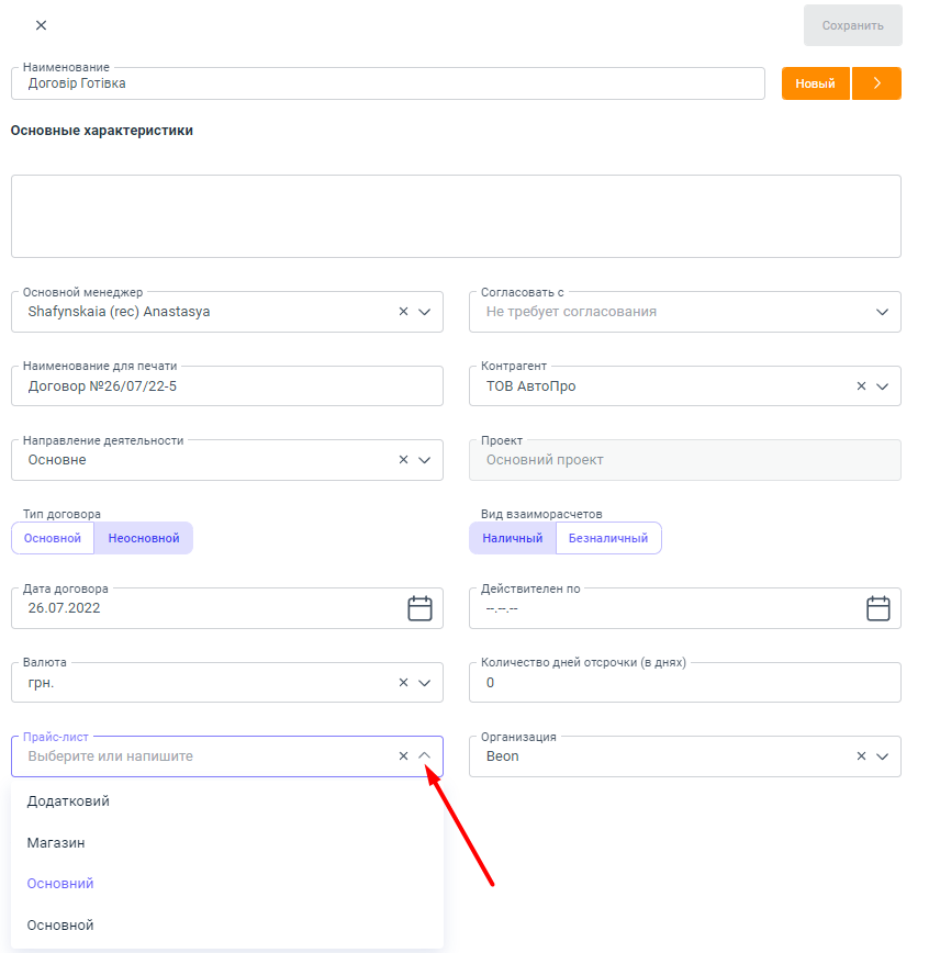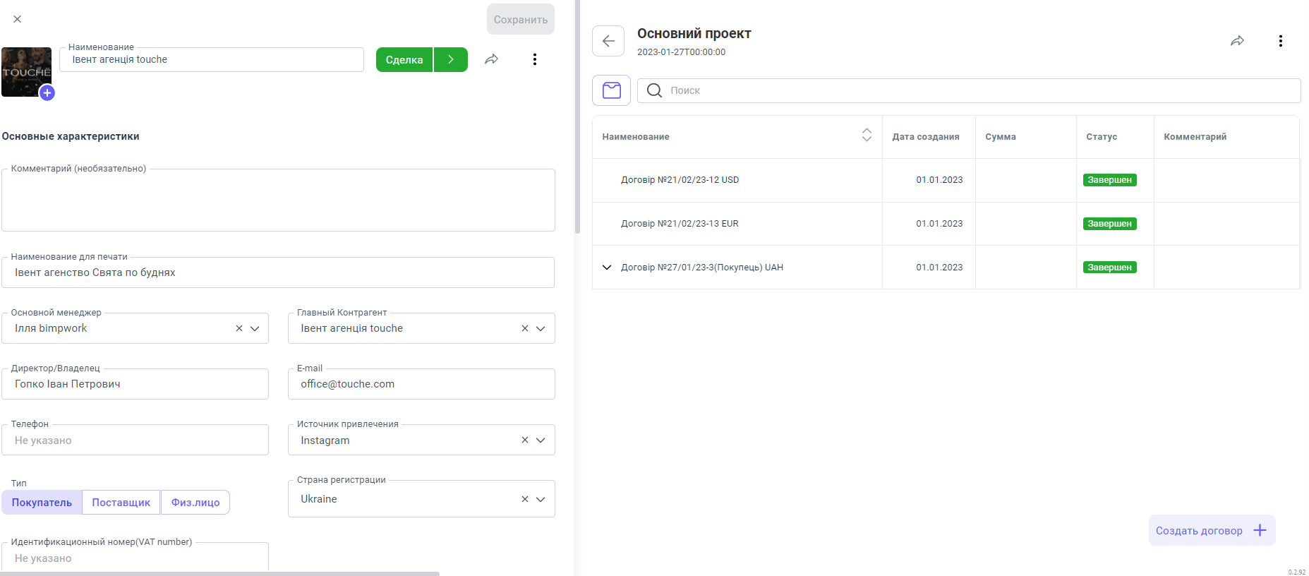 Далее, вы видите Договор, который обозначает условия сотрудничества с данным контрагентом и открываете его.