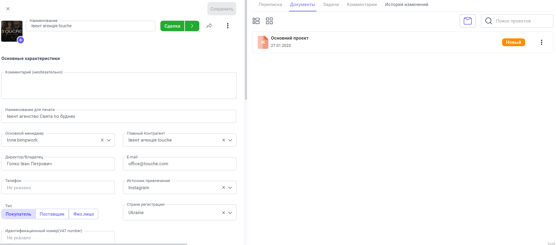 Заходим в карточку необходимого нам контрагента (покупателя) и в правой части рабочего поля выбираем Проект в рамках которого вы хотите произвести продажу товаров/услуг.