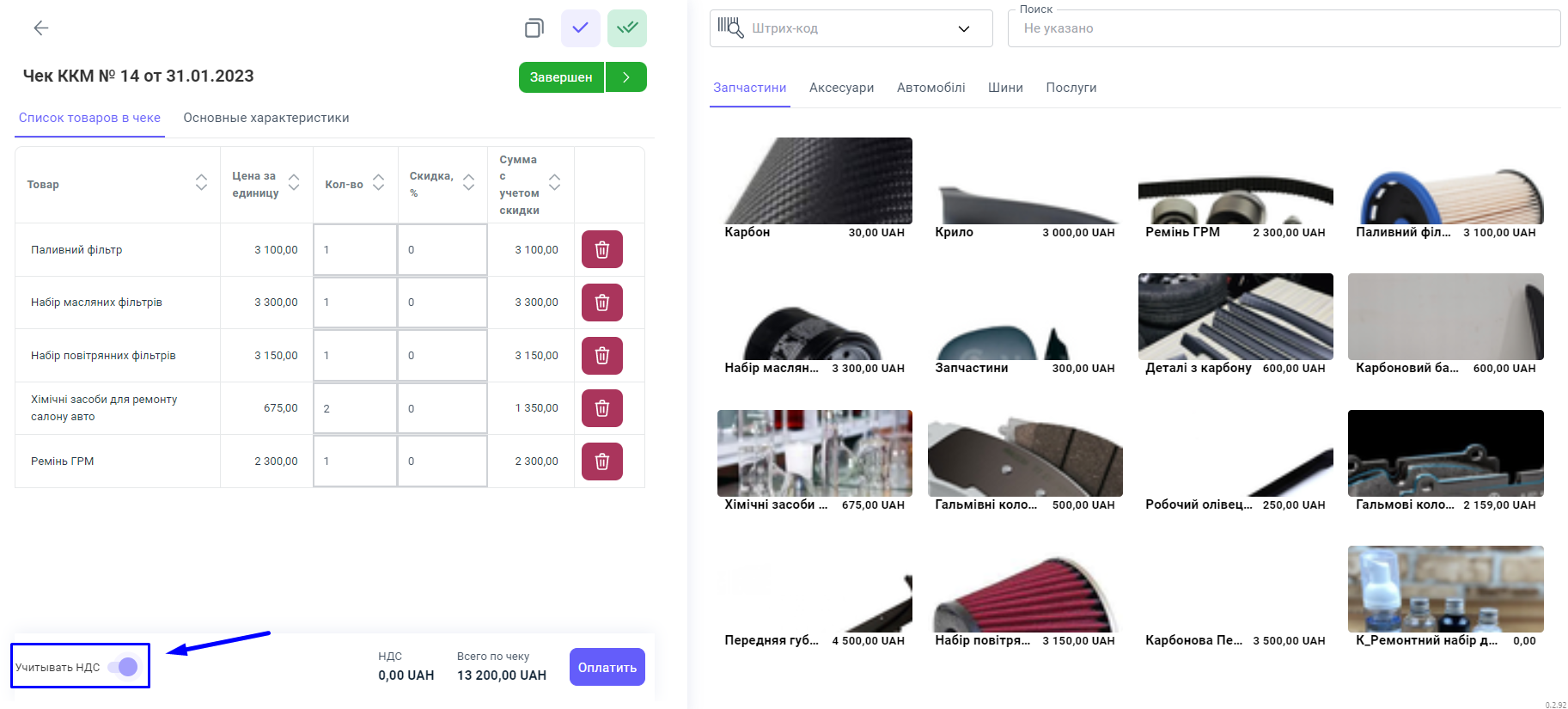 При создании документа, мы можем учесть ставку НДС с помощью кнопки "переключателя". Ставка НДС просчитается автоматически.