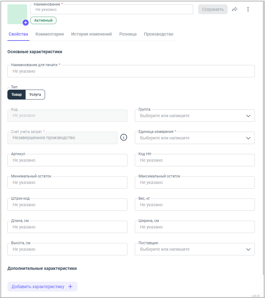 После нажатия кнопки, перед нами открывается карточка номенклатуры.