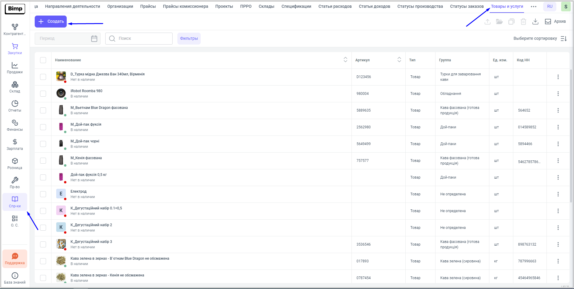 Товары и услуги. Блок Справочники.