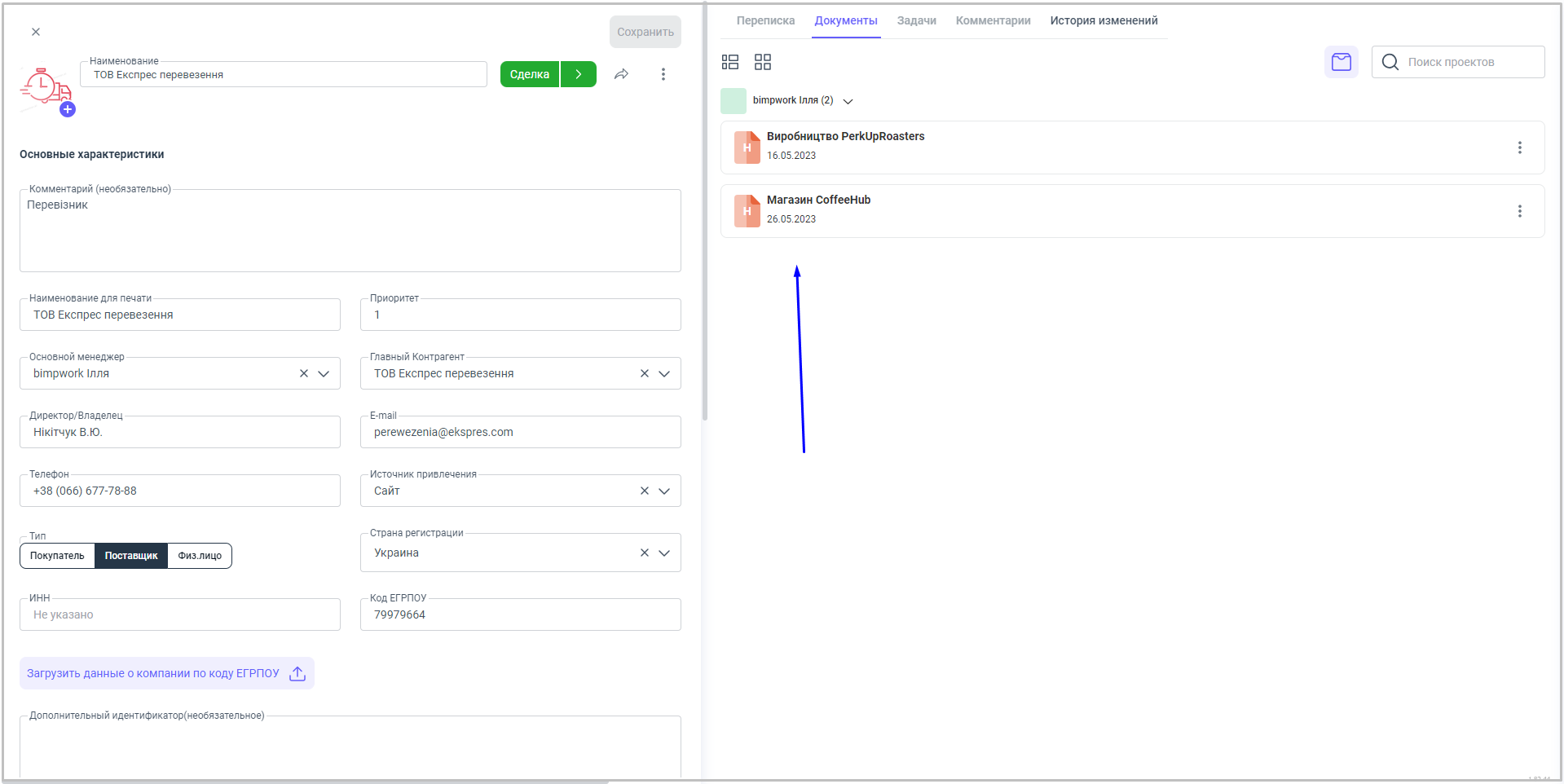 После нажатия кнопки, перед нами открывается карточка контрагента.