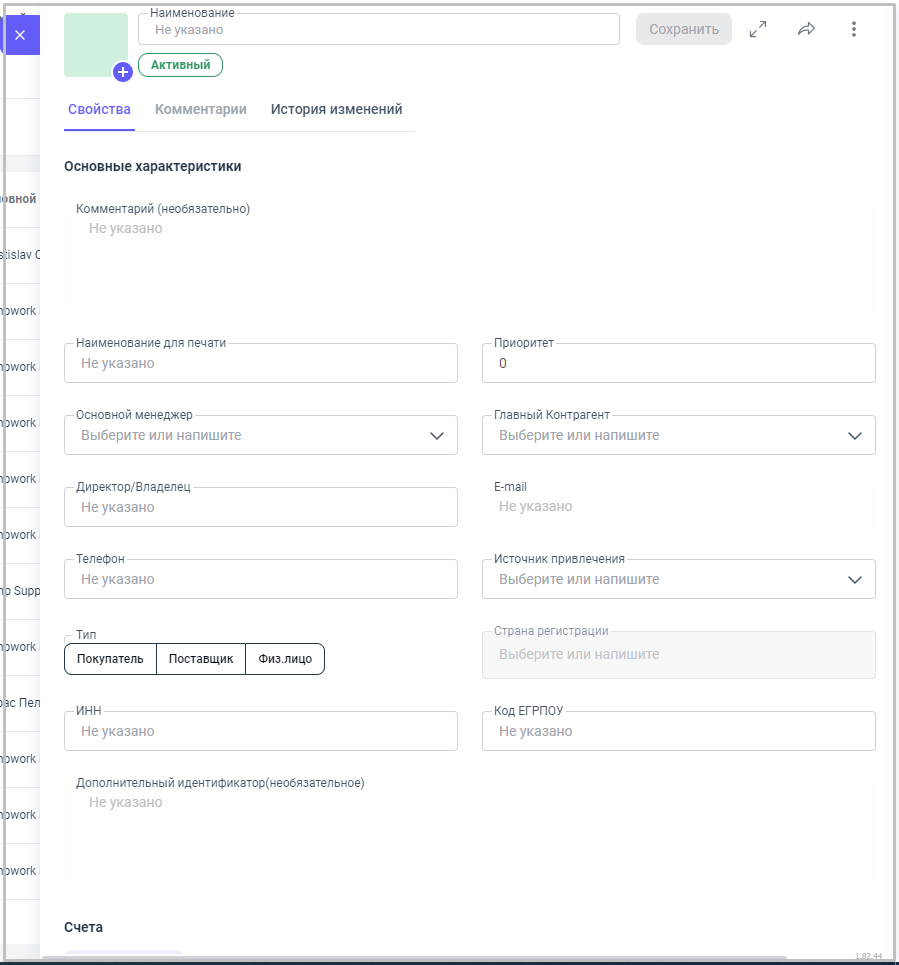 1. В верхней строке карточки вносим название контрагента, а также с помощью кнопки "+" подгружаем в карточку фото контрагента (фото инвестора, фирменный знак организации и т.п.).