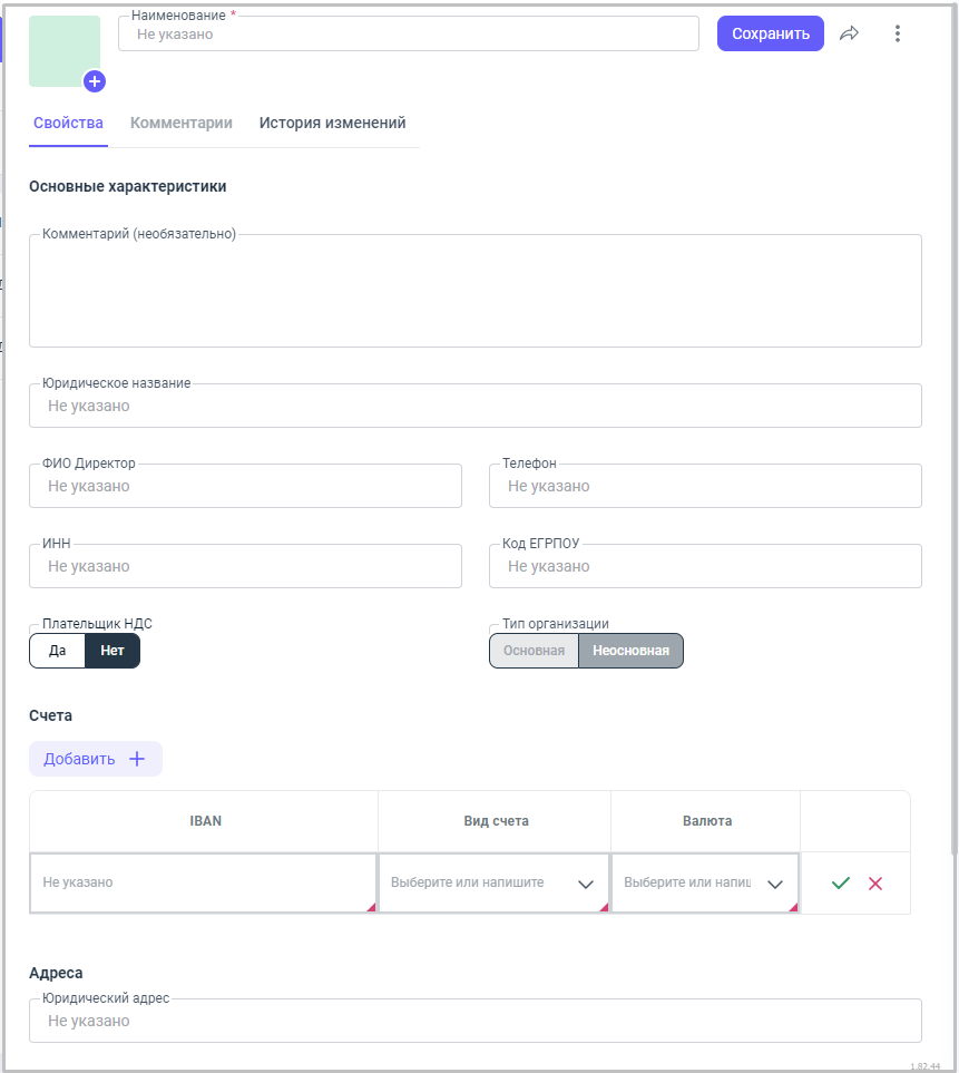 1. В верхней строке рабочего поля карточки, вписываем название организации;