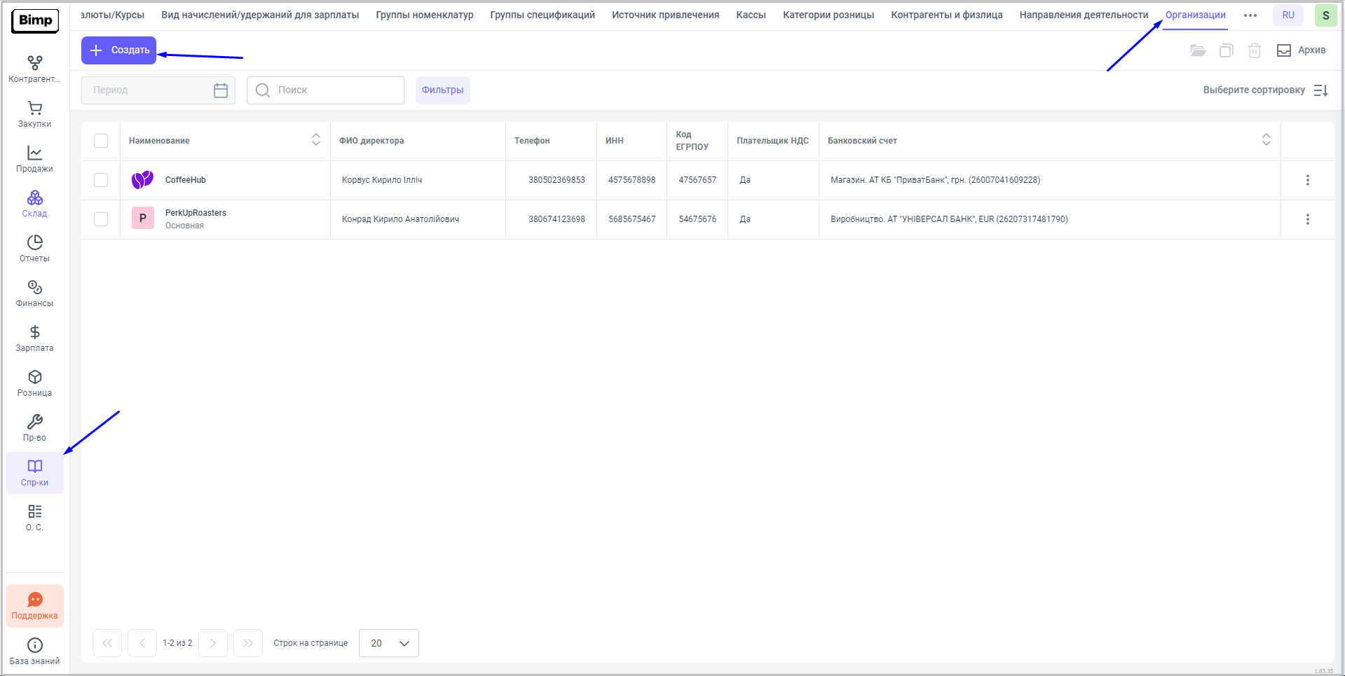 Новую организацию в данный справочник возможно добавить — вручную. Для этого, необходимо нажать на кнопку Создать на рабочем поле справочника.