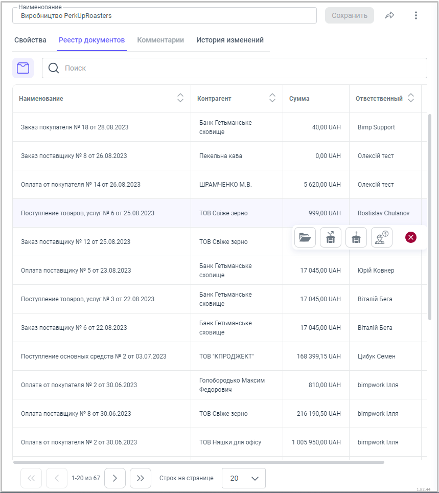 Во вкладке Реестр документов отражен перечень всех договоров и документов созданных на их основе. При наведении договора и документа появится меню кнопок создания документов.