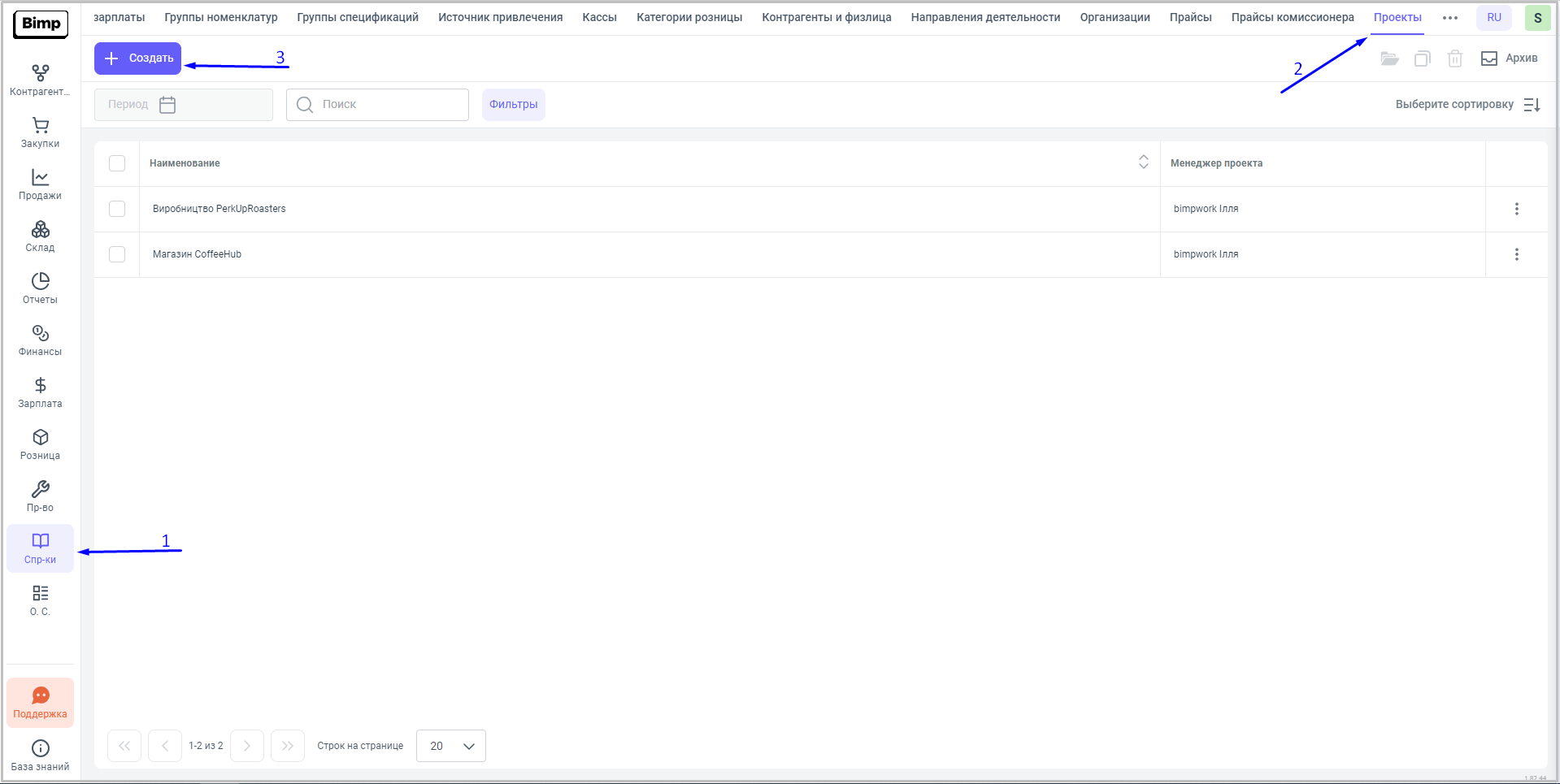Новый проект возможно добавить вручную. Для этого, необходимо нажать на кнопку “Создать” на рабочем поле справочника.
