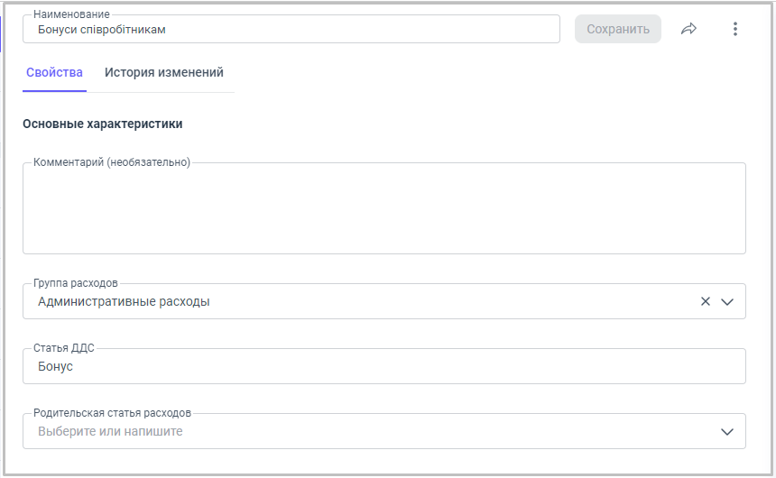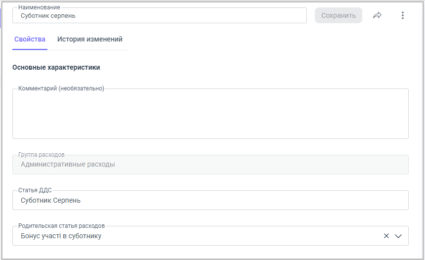3. При создании статьи расходов "Субботник в августе", выбираем родительскую статью расходов "Бонус за участие в субботнике".