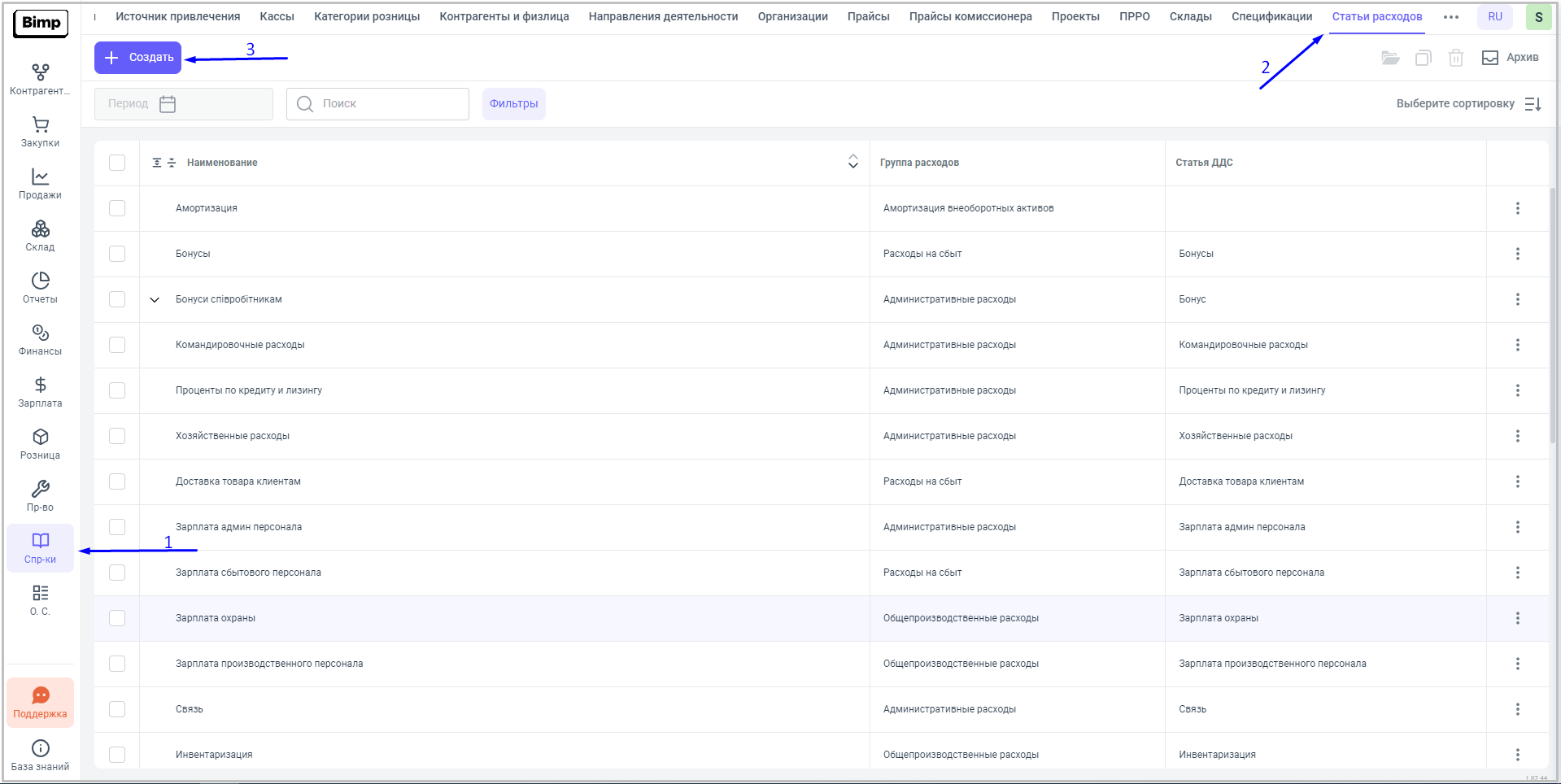 Статьи расходов возможно внести вручную. Для этого, необходимо нажать на кнопку "Создать" на рабочем поле справочника.