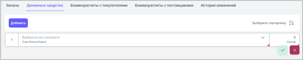 После нажатия кнопки, появляется строка для заполнения информации по счету/кассе/карте, финансовые остатки на который вы хотите внести.