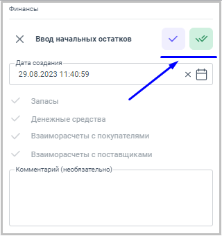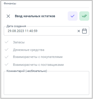 В левой части, необходимо указать Дату создания, а также, при необходимости, оставить комментарий для данного документа.