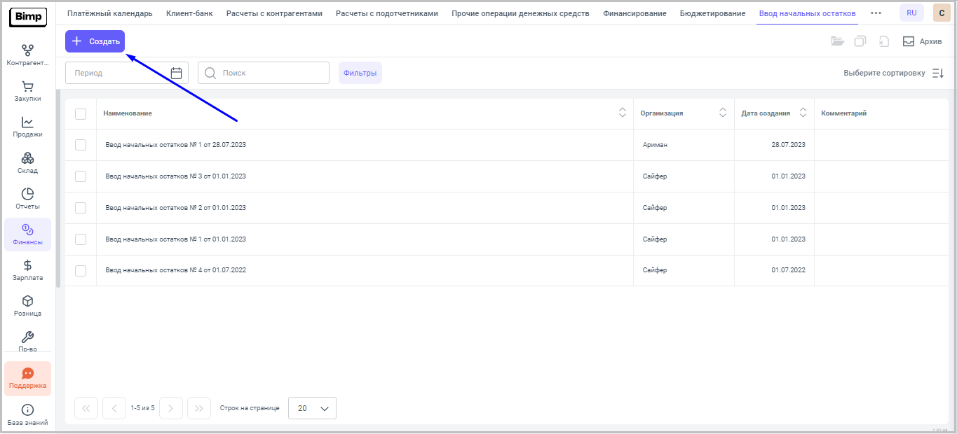 Нажимаем кнопку "+ Создать" на рабочем поле раздела Ввод начальных остатков, блока Финансы.