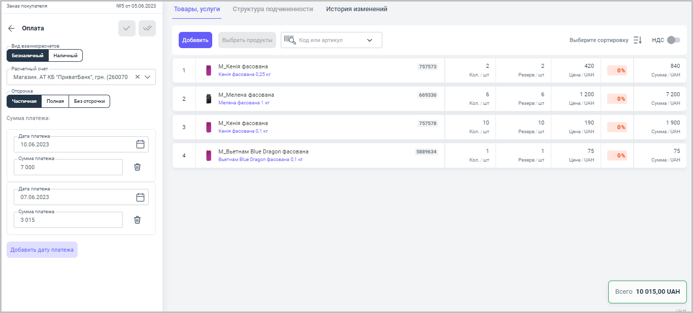 Например, мы поставили отсрочку платежа за товар в две даты: 10.06.2023 - 7000 грн, 07.06.2023 - 3015 грн.