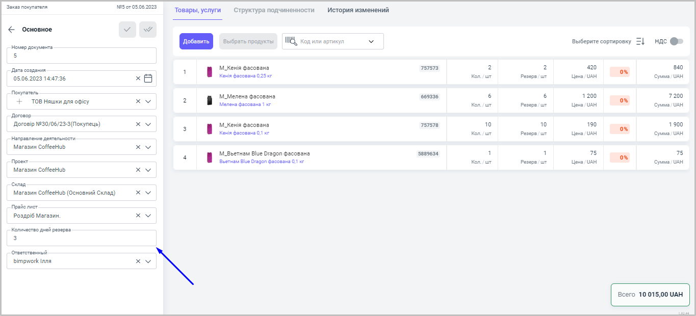 Также, мы можем регулировать какое количество дней данный товар будет находится в резерве, с помощью строки в документе - Количество дней резерва, в секции Основное.