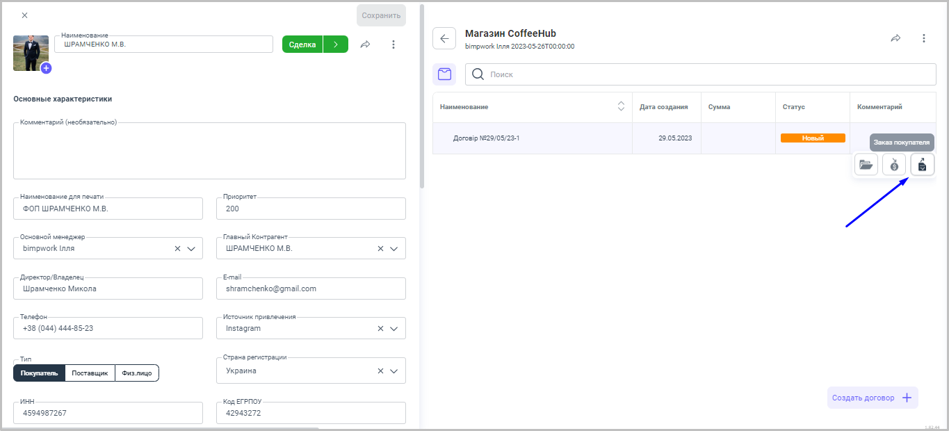 І - Документ "Заказ покупателя" вы можете создать в блоке Контрагенты выбрав карточку необходимого контрагента с типом — покупатель.