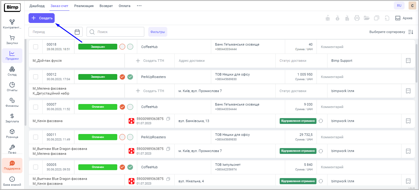 В сервисе Bimp, для того, чтобы продать товар со склада/торговой точки компании, первоначально нужно создать документ "Заказ покупателя". Без его создания, вы не сможете отгрузить товар со склада/торговой точки = создать документ "Продажа товаров, услуг".