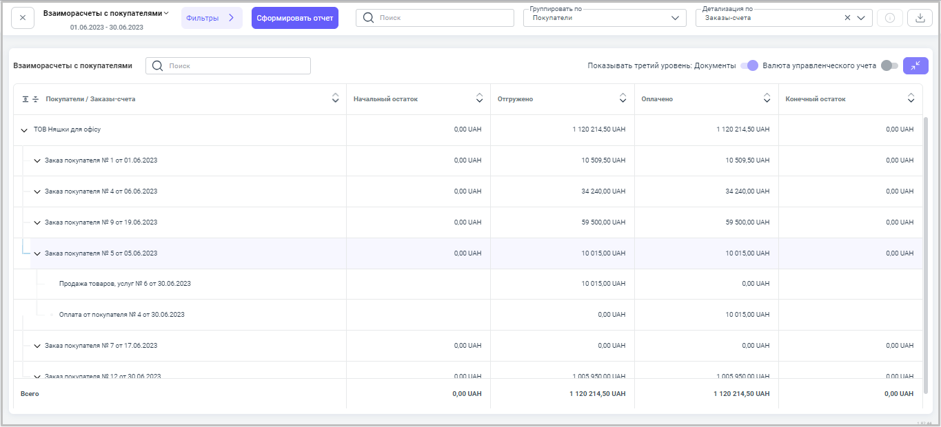 После проведения на основе счета продажи товара со склада компании, в отчете мы можем увидеть по какому контрагенту и на какую сумму был продан товар, а также можем отслеживать нашу дебиторскую задолженность по каждому покупателю.