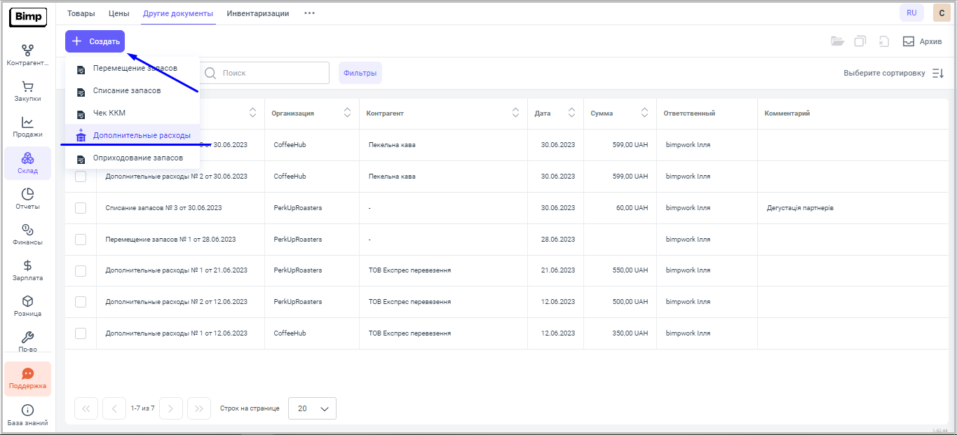 ІІ - вы можете создать данный документ через блок Склад раздел Другие документы, нажав на кнопку "Создать" и выбрав строку Дополнительные расходы. а
