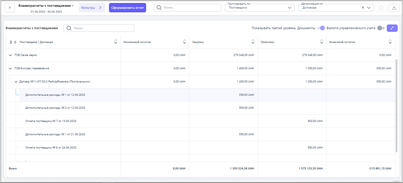 Данные с этого документа попадают в отчет — Взаиморасчеты с поставщиками.