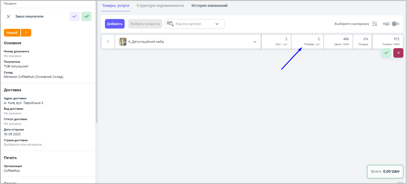 ІІ - В правой части заказа, при добавлении позиции номенклатуры, в столбце документа - Резерв, автоматически проставляется, такое же количество единиц товара для резерва, как и тех что мы продаем.