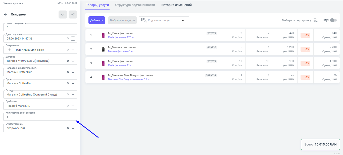 На сервисе Bimp, для того чтобы поставить на резерв товар на складе, необходимо провести документ "Заказ покупателя", благодаря данному документу мы можем зарезервировать товар под определенного покупателя/конкретный его заказ.