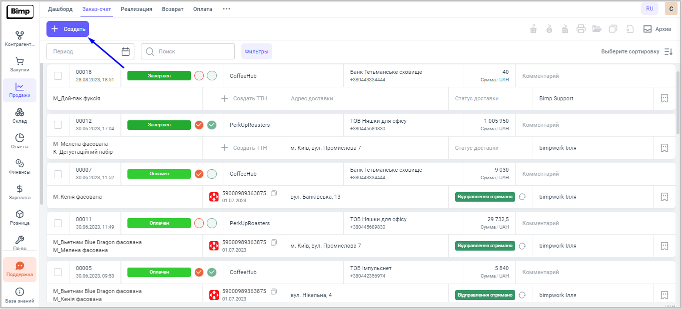 І - Необходимо создать документ "Заказ покупателя", для этого переходим в блок Продажи, раздел Заказ-счет, нажав на кнопку "+ Создать".