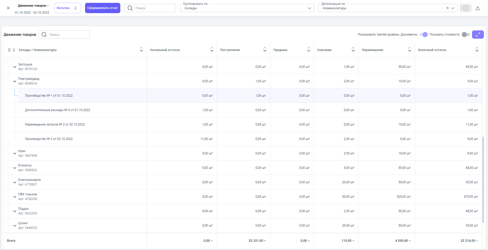 После создания документа "Производство, разборка" на основе спецификации, данные с этого документа попадают в отчет — Движение товаров.