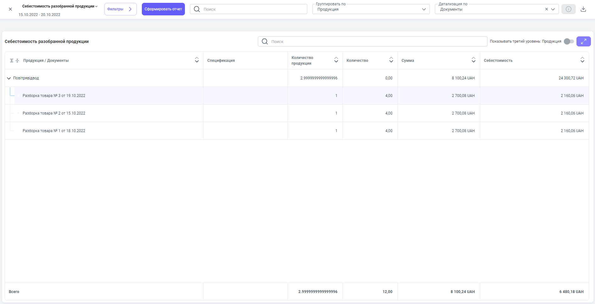 После проведения на основе спецификации разборки на производстве, в отчете мы можем увидеть с помощью какого документа был разобран продукт, на какое количество, сумму, а также себестоимость каждого составляющего разобранного продукта.