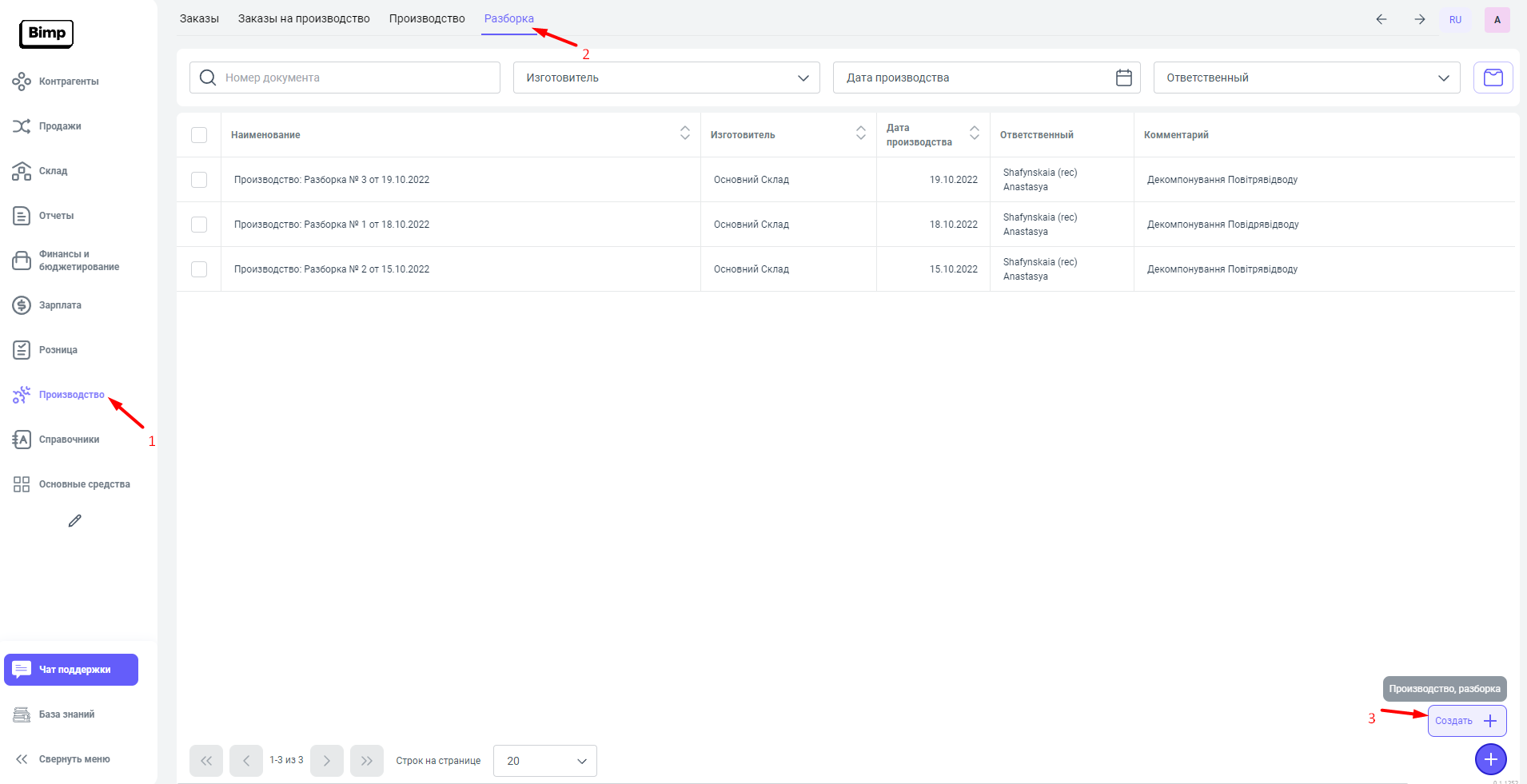 Документ "Производство, разборка" вы можете создать в блоке Производство раздел Разборка нажав на кнопку "Создать".
