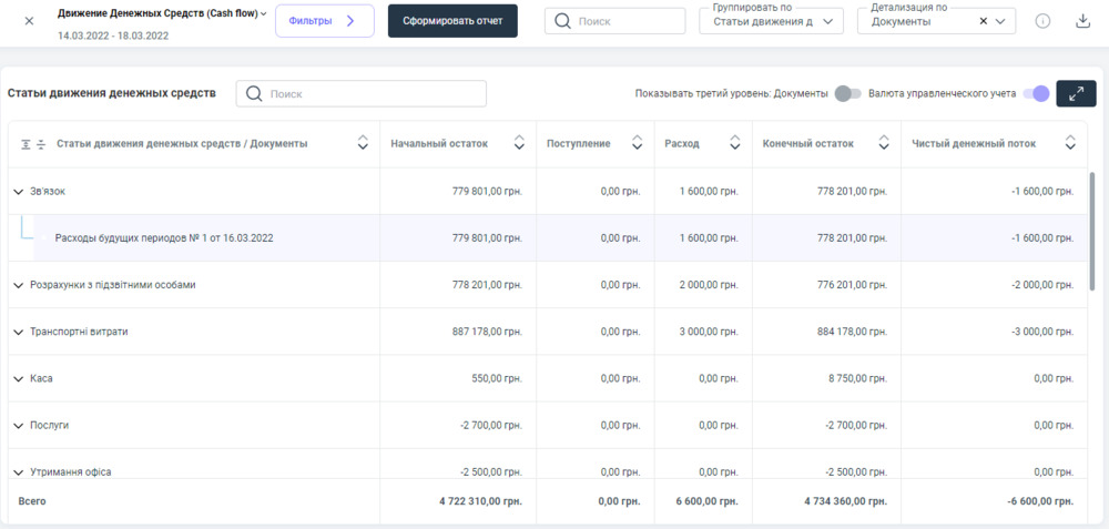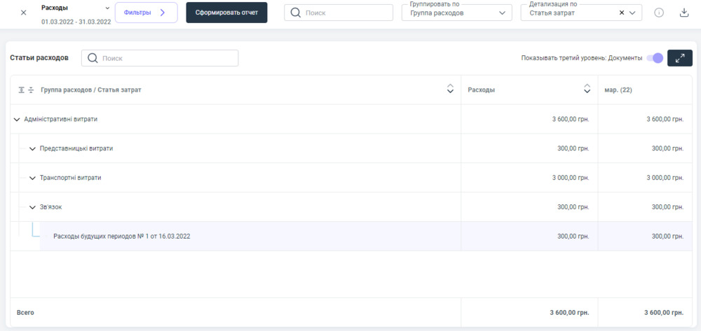После проведения расходов данным документом, в отчете мы можем увидеть по какой статье произошел расход, на какую сумму и с помощью какого документа ( его номер и дата создания), а также по какому поставщику произошел расход и с какой кассы/счета была списана сумма расхода.