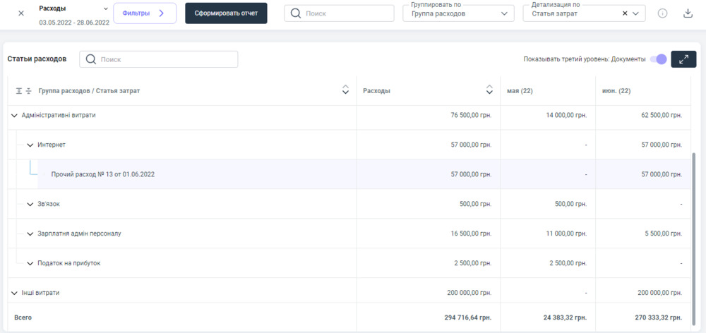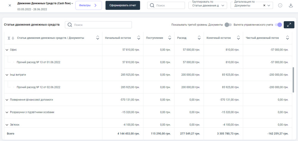 После проведения расходов данным документом, в отчете мы можем увидеть по какой статье произошел расход, на какую сумму и с помощью какого документа (его номер и дата создания), а также с какой кассы/счета была списана сумма расхода.