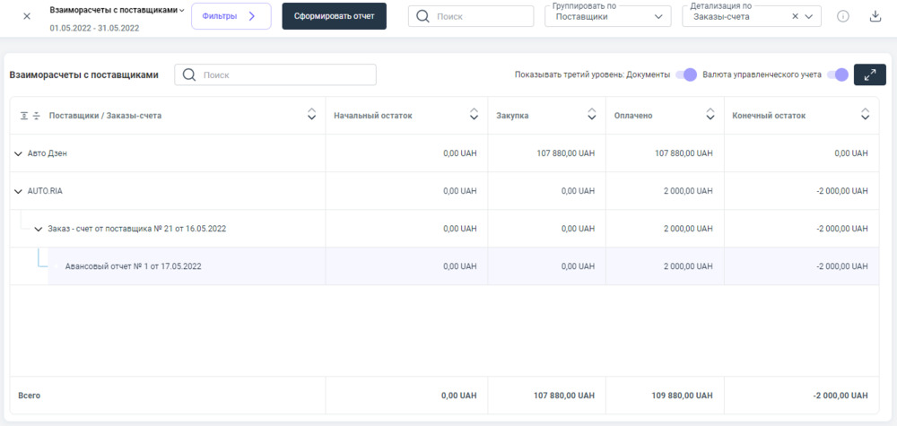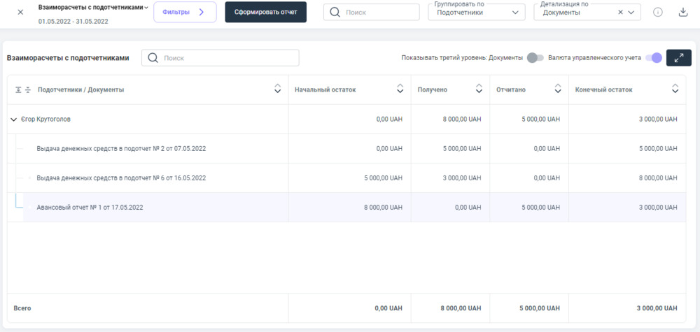 После создания документа "Авансовый отчет", данные из него попадают в отчет – Взаиморасчеты с подотчетниками.