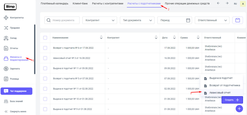 На сервисе Bimp, для того чтобы отчитаться об израсходованных денежных средствах, ранее выданные авансом в подотчет сотруднику компании для выполнения определенного служебного поручения, необходимо оформить документ "Авансовый отчет".