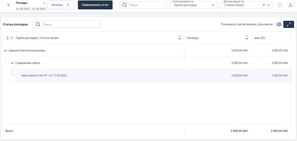 В отчете мы можем увидеть по какой группе и статье расходов была отчитана сумма денежных средств, каким документом и его сумма.