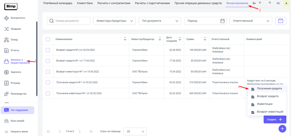 На сервисе Bimp, для того, чтобы зафиксировать получение кредита нашей компанией, необходимо создать документ "Получение кредита".